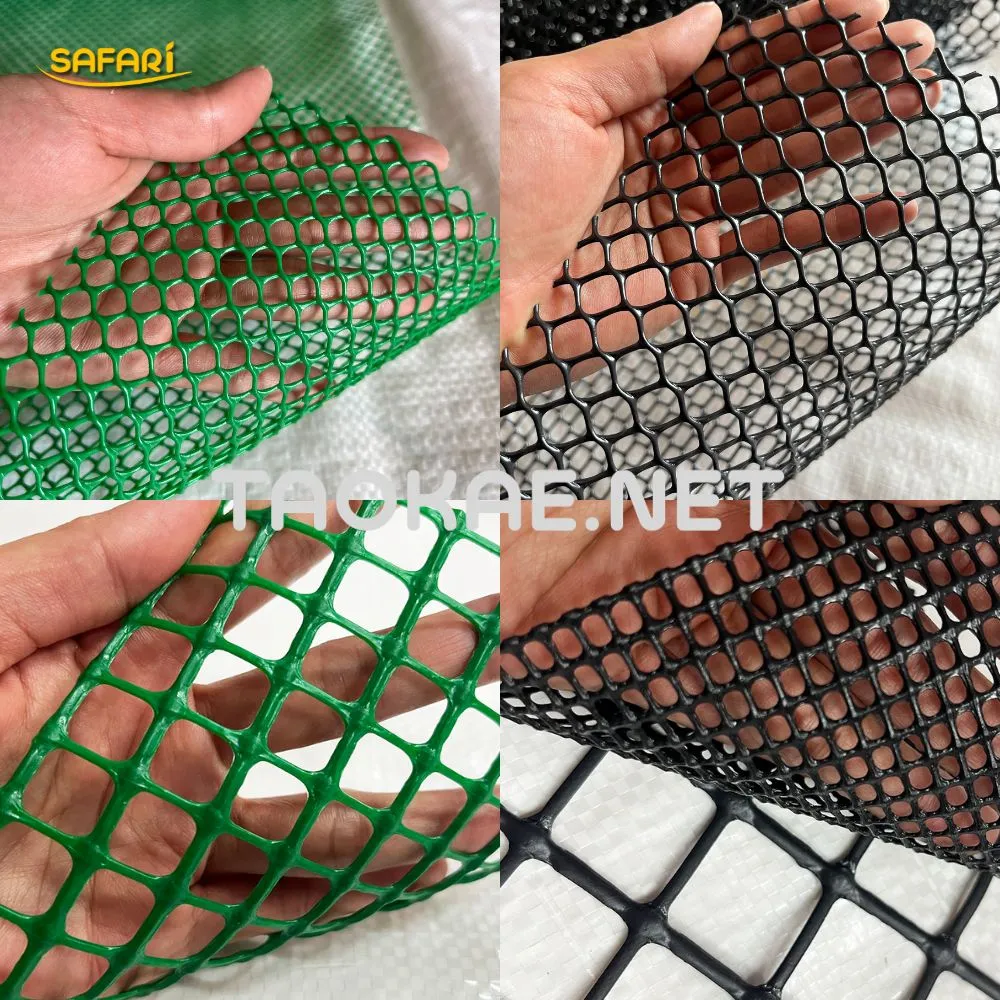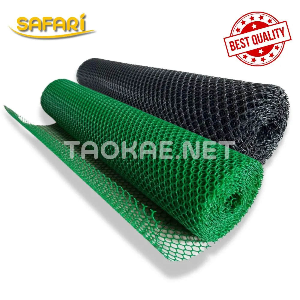ตาข่ายพลาสติกอเนกประสงค์ แบรนด์ SAFARI ผลิตจากเม็ดพลาสติก HDPE (High-Density Polyethylene) คุณภาพสูง ผสมสารป้องกันรังสี UV เพื่อความทนทานต่อสภาพอากาศเมืองไทย ไม่เปราะหักง่าย และมีอายุการใช้งานที่ยาวนานกว่าทั่วไป มาพร้อมตัวเลือกที่ครบครันที่สุด ไม่ว่าจะเป็น ตา 4 เหลี่ยม หรือ 6 เหลี่ยม มีขนาดตาให้เลือกตั้งแต่ 1 – 50 มม. และหน้ากว้างมาตรฐาน 0.9 – 1.8 เมตร ตอบโจทย์ทุกการใช้งานทั้งสีเขียวธรรมชาติและสีดำคลาสสิก โดยท่านสามารถเลือกซื้อได้ทั้งแบบ ตัดแบ่งขายตามเมตร เพื่อความประหยัด หรือแบบ ยกม้วนยาว 30 เมตร ในราคาส่งสุดคุ้มจาก TAOKAE.NET