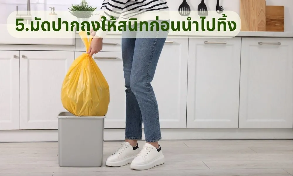 ก่อนนำขยะออกจากห้อง พยายามรีดอากาศออกและมัดปากถุงให้แน่นที่สุดเพื่อกักเก็บกลิ่น การเลือกใช้ถุงที่มีขนาดพอดีกับถังขยะจะช่วยให้เหลือพื้นที่ปากถุงมากพอที่จะมัดได้สะดวก ไม่หลุดง่ายระหว่างเคลื่อนย้าย